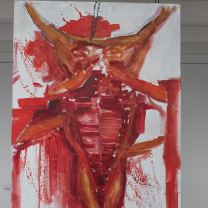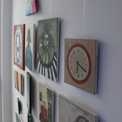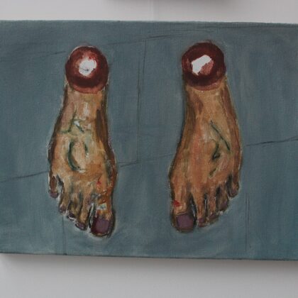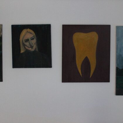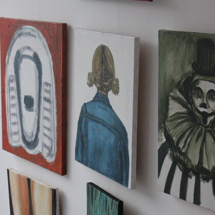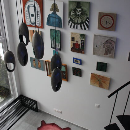 Her paintings include both clowns and shoes, but the title of the exhibition was also chosen semi-consciously from a never-ending stream of information. The expression, which does not seem to be naturally used in Lithuanian, sticks because of its imagery, the bright clown shoes are visually reminiscent of the artist's paintings. However, the term clownshoes has been interpreted as an insult to someone who is impractical, out of place, trying too hard to please, a loser, and therefore essentially a clown. Sometimes artists wonder if you are in your place, if you are really an artist, and maybe it's scary to be fooled and art itself is so impractical. Finally, sometimes you want to please the audience or some kind of standards, but in the end you still follow your intuition...