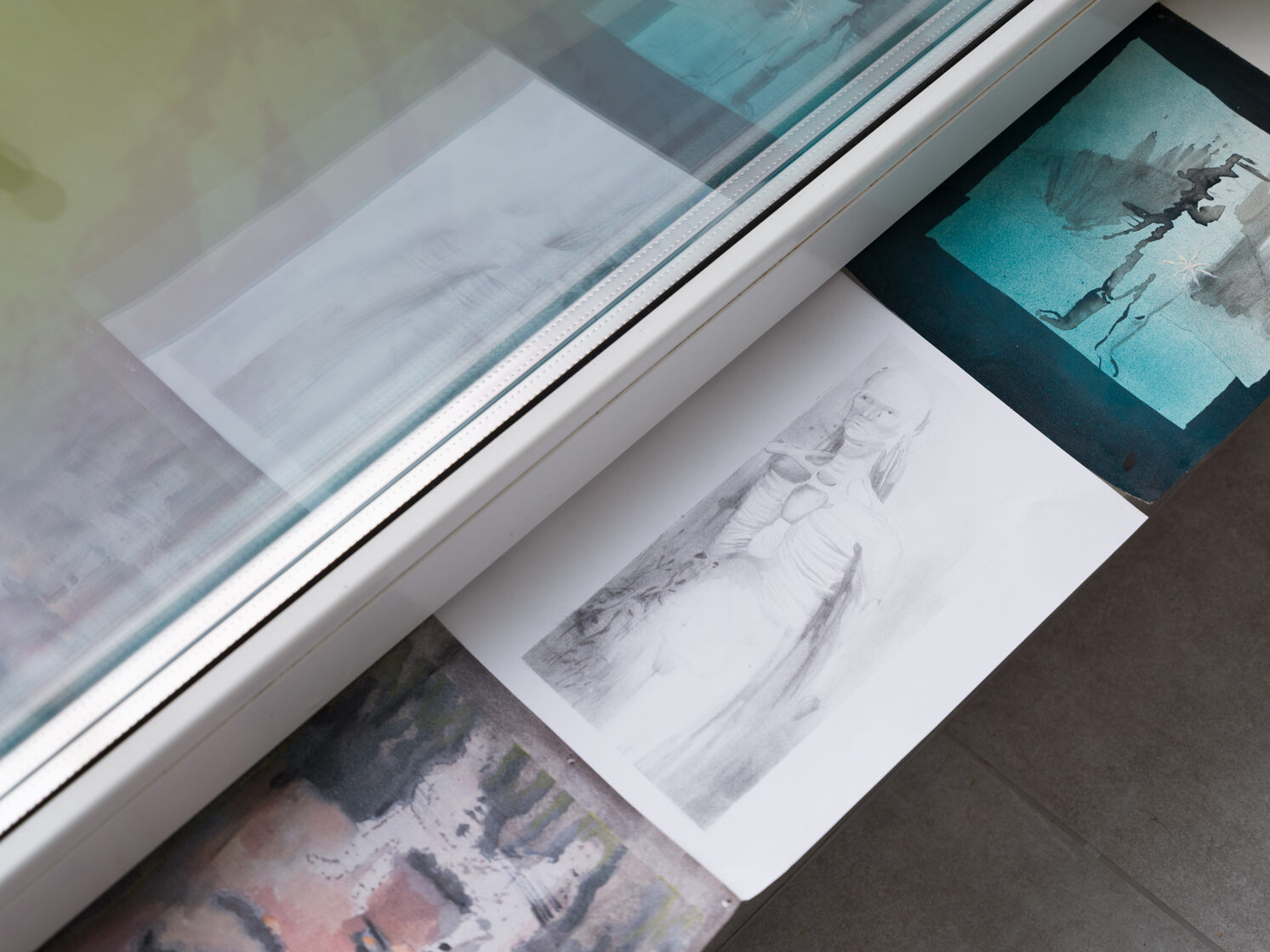 As if clad with metal ornaments, the drawings here become testimonies of the present, acting as essential supporting structures. The elongated poetic brush stroke is reinforced with pencil, rendering frames and objects more easily identifiable. It all functions as some sort of hand-operated manifestation system, grounding, among other things, the existence of the woman creating it. But where have the mythologised, fading memories of goddesses, or maidens, as the artist also calls them, gone this time? They are travelling from the valleys of oblivion towards intrinsic knowledge. The exhibit evokes an unending poem interrupted by remnants of industry, housing district folklore, and sterility. An appropriate grammar is forming out of saintly care and living creatures inside paintings, as well as diptychs and portals.