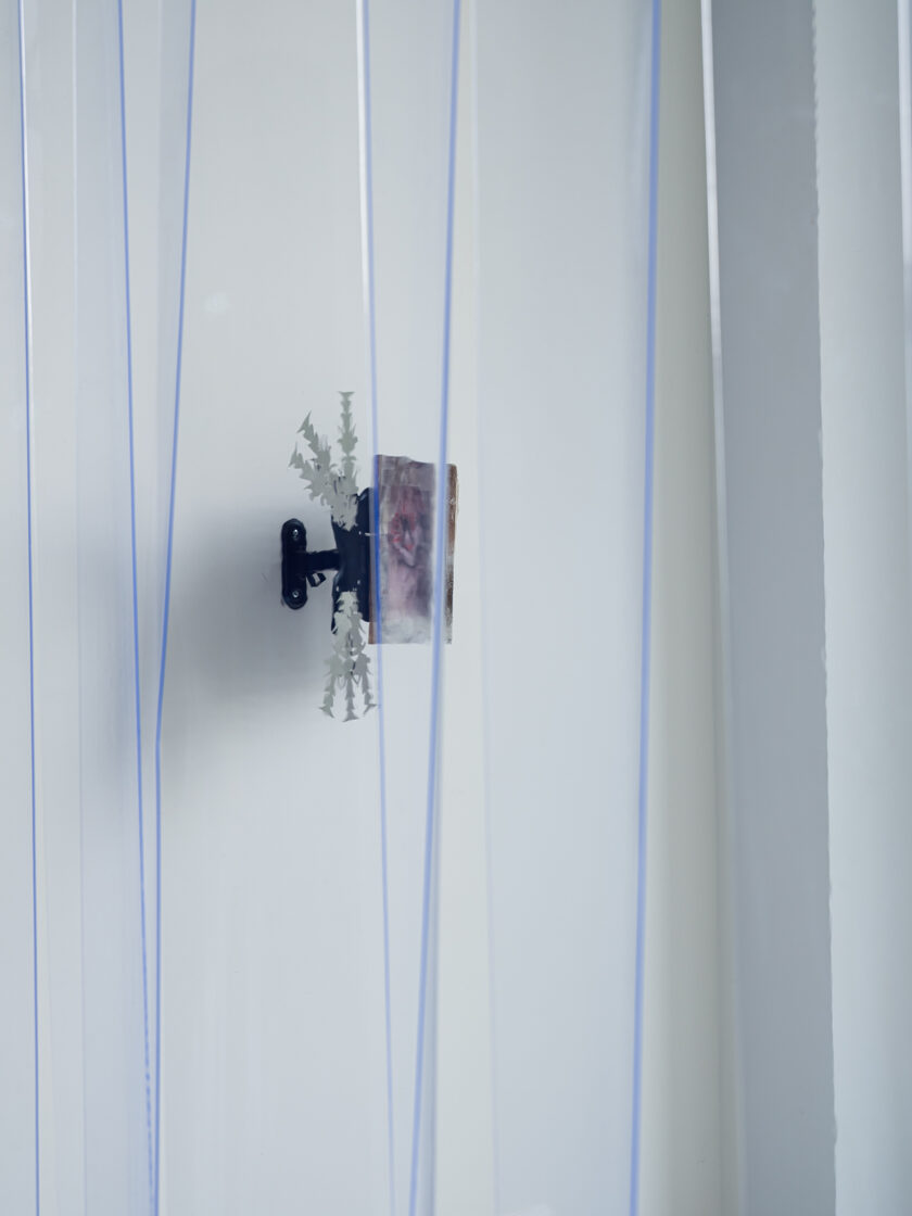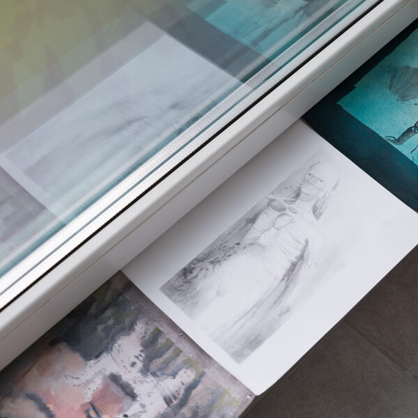 Magyla, Landscape of Twins, and Artefact form something of a holy trinity in the space, a triangle pulsating with energies. The three works act as a root system, feeding each other and perhaps warning each other of approaching spectres. These, harnessed by nostalgia, are constantly going through the whirlwinds of resurrection and appropriation. They become lifelines keeping that which is most important alive and well. Catching one ghost, a forgotten maiden, a goddess, by the tail, the digitised robotic eye turns towards the next. The structure runs on memories, promises, grief, and self-blessing.