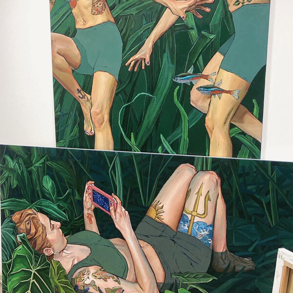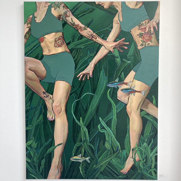 Asinus, with her distinctive painting technique, depicts the green lushness of reality emerging from the eternal ocean of consciousness, the source of everything, marked by the blue color of the first layer. Her almost relief-like paintings preserve information and stories like the engravings of ancient civilizations. By depicting the greenery of the Amazon jungle and the tattooed figures surrounding it, the artist references the collective consciousness expressions of the planet's 9 billion inhabitants. Shiny red crystals and white Lemurian quartz speak of the planet's richness in geological materials and infinite wisdom, forgotten and hidden beneath layers of everyday life and socio-cultural constructs.