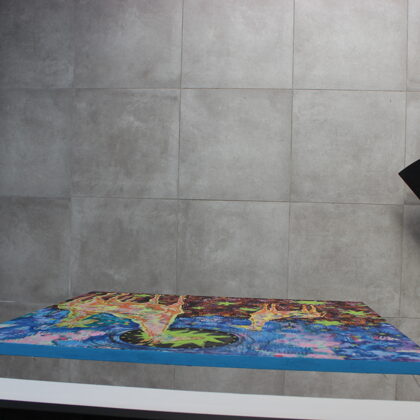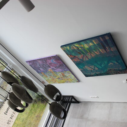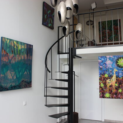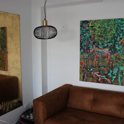 The works on display are the starting point for the artist's large series of paintings "Savannahs". It is like an introduction, a prelude or a pre-history to a long and colourful journey into the decorative world of plant and animal motifs. The landscapes in Savannah are full of ornaments, dashes and dots, which create a dynamic image that promises an encounter not only with the shapes and forms of exotic animals and plants, but also with mysterious archetypal or totemic phenomena. The author's imagination and vivid colours shine through here; it is like looking at the motifs of a distant land through the eyes of a child (in reality, the colours of the arid savannah are not necessarily so varied and vivid). The artist has created a setting for a world that has not yet been entered by man, and the viewer's imagination is left free to create plots of what could happen in this environment (a safari, an encounter with one's own self or with ancestral spirits). Savannah motifs represent not so much specific places or flora and fauna, but rather the author's fantasy world, the intricate recesses of the unquenchable subconscious, the expectations and fears of the inner child, and the detachment of the inner child from the everyday reality and everyday life. There is not only fun in this fairy tale, but also a bit of tantalising fright, insecurity - the feelings that children experience when listening to creepy things: predators, evil spirits may be hiding behind the bushes and grasses. There is also a barely perceptible danger of losing the thread of reality, of being bewitched, of getting lost, of entering into this fantastic world. This sense of danger, this unease, protects the author from pointless decorativeness or "Disney-esque" depictions of humanised animals, and at the same time from a simplistic, sweetened treatment of the child's consciousness.