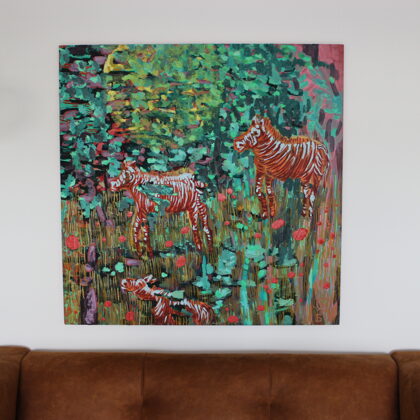 The word "savannahs" sounded unfamiliar, magical to me as a child. Before I started painting the Savannahs series, I read and looked at many children's illustrations available on the internet. The pictures were mostly about animals living in the savannah in Africa. I saw animals of all shapes and forms, but they were always fun, playful and memorable. The longer I looked for material, the more I realised that I was still only a child myself. So I stuck to my play world on canvas, illustrating, replicating savannahs I had never seen, animals seen in the flesh in only a few European zoos, turning them into fragments of memories of my own childhood wonder and flashes of colour.
