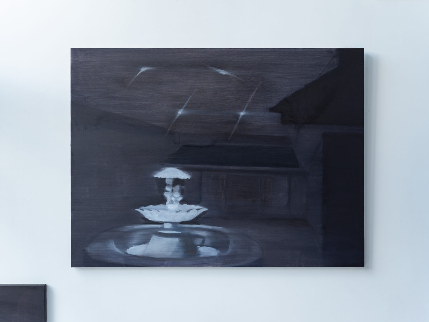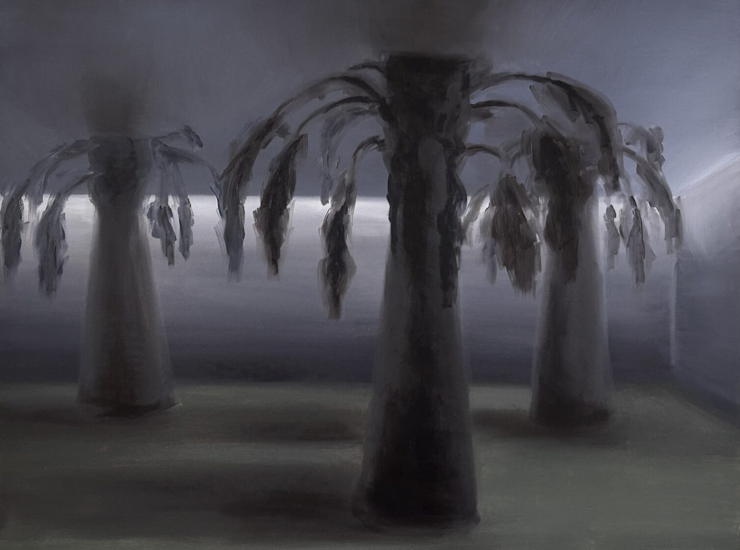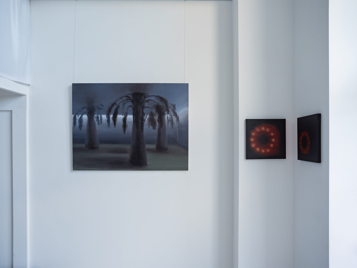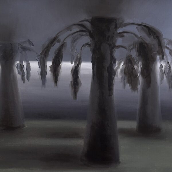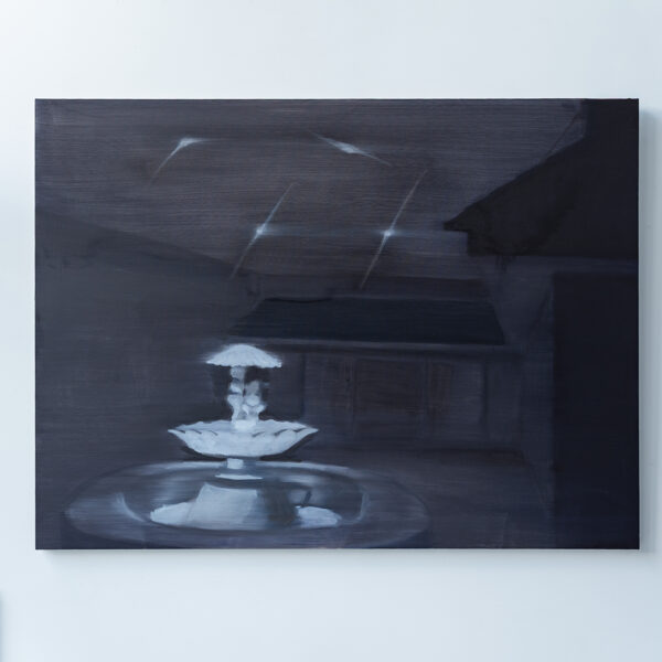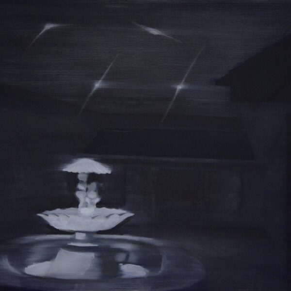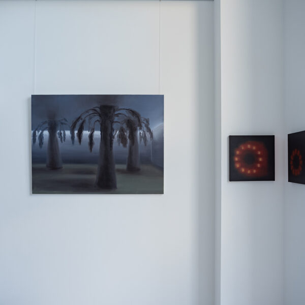 Tranquillity is also sought, albeit in prop form. Plastic palm trees, elaborate fountains installed in underground Cold-War-era bunkers, built to protect against atomic bombs – a life reserved for day X. For Kemeklė, this plastic comfort and detachment from reality equates to a loss of (animalistic) instincts. The same applies to the synthetic horizon, when stars in the sky fade and give way to headlights, glowing windows, and streetlamps. The life between dawn and dusk, between inner glow and darkness, unfolds in the company of at least several watchful eyes. And fantasies.