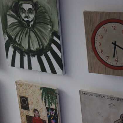 Tapytojos paveiksluose rasite ir klounų, ir batų, tačiau parodos pavadinimas taip pat atsirinko pusiau pasąmoningai iš nesustojančio informacijos srauto. Pasakymas, atrodytų, nėra natūraliai vartojamas mūsų aplinkoje prilipo dėl savo vaizdingumo, ryškūs klouno batai vizualiai primena dailininkės paveikslus. Tačiau terminas clownshoes aiškinamas kaip įžeidimas kažkam nepraktiškam, ne savo vietoje esančiam, per daug įtikti besistengiančiam žmogui, nevykėliui, taigi iš esmės klounui. Kartais menininkams kyla klausimai, ar esi savo vietoje, ar tikrai esi menininkas, ir gal baisu apsikvailinti, o pats menas toks nepraktiškas. Pagaliau kartais norėtųsi įtikti žiūrovams ar kažkokiems standartams, bet galų gale vis tiek seki savo intuicija...